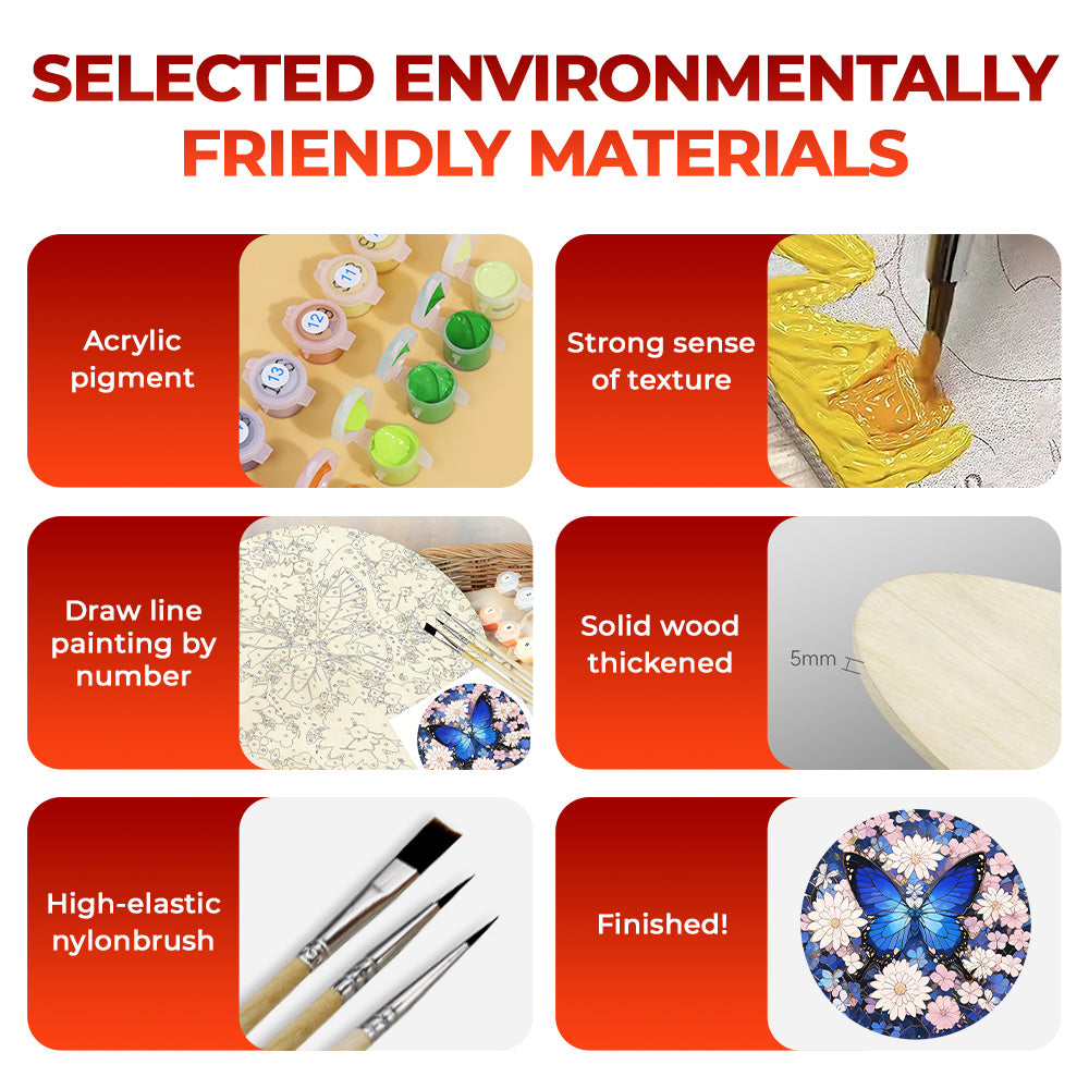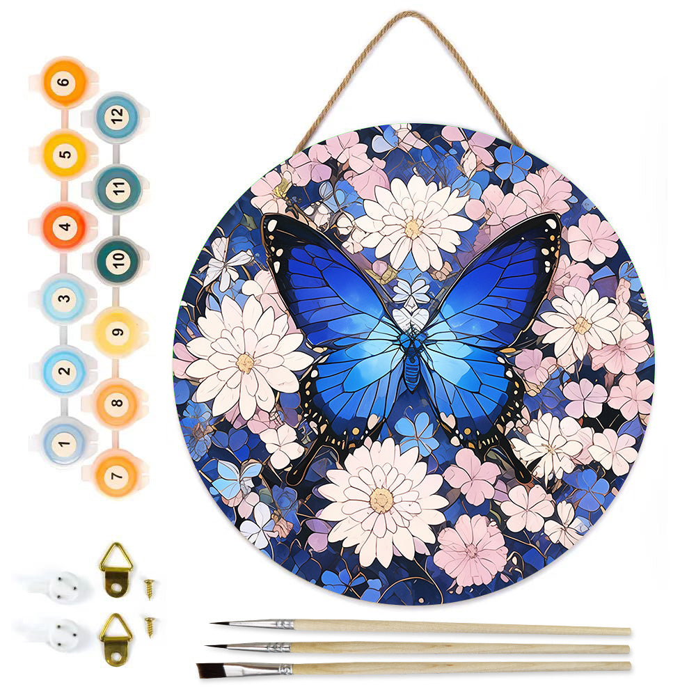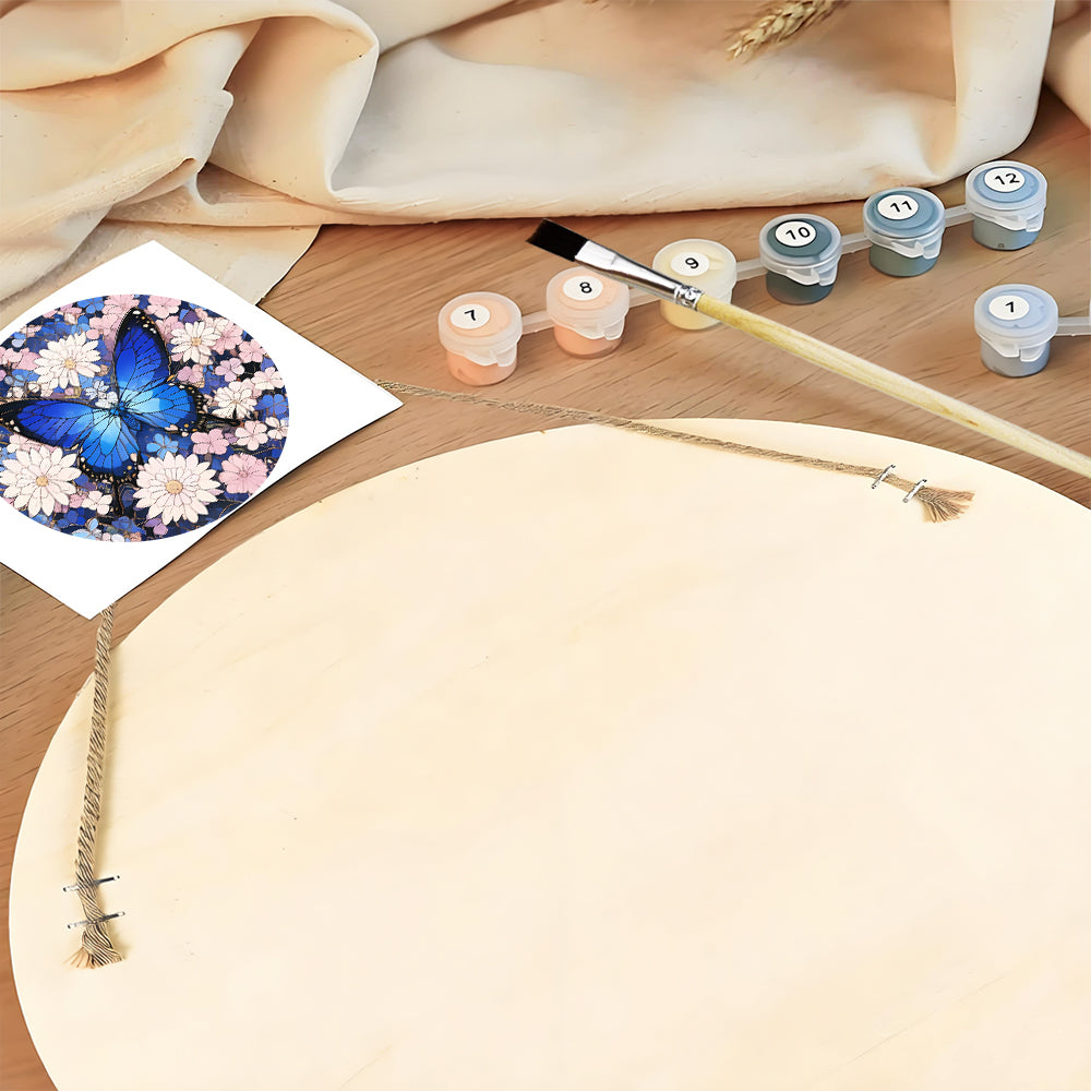 Paint by Numbers on Wood Slice - Blue Butterfly among the Flowers