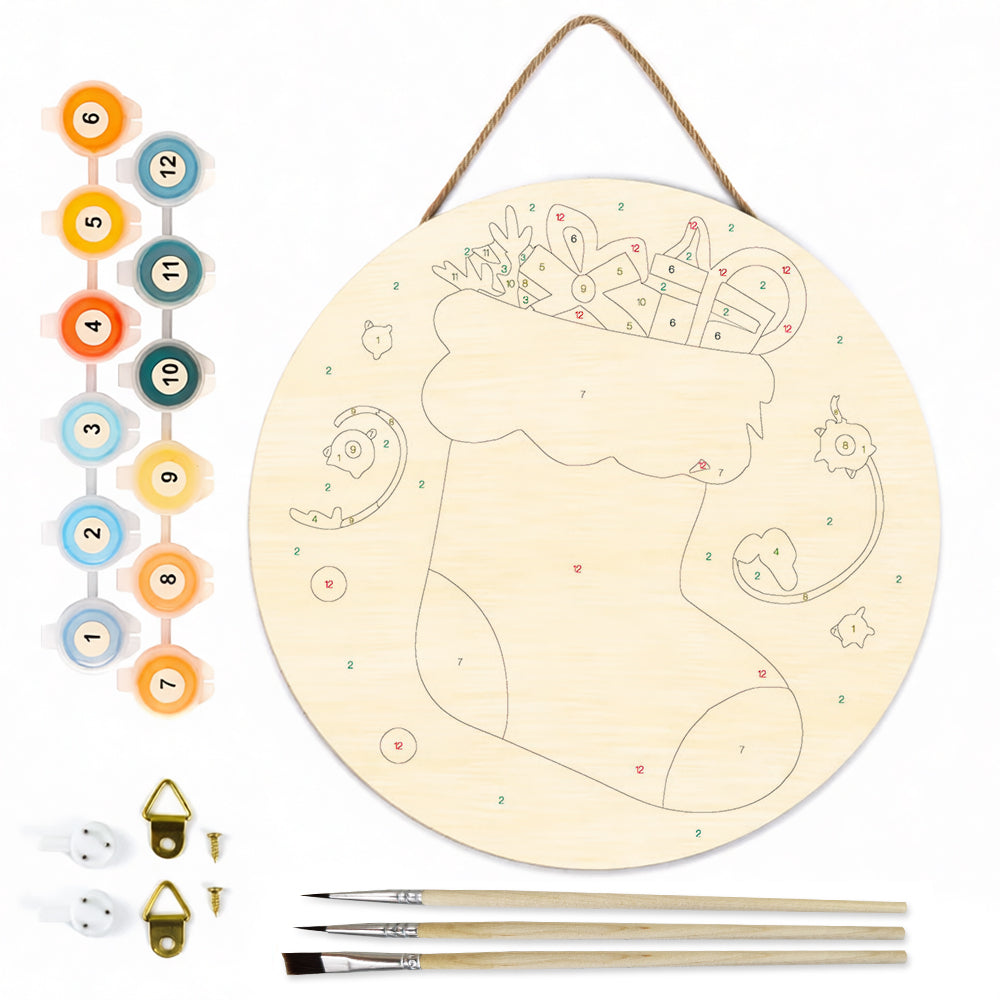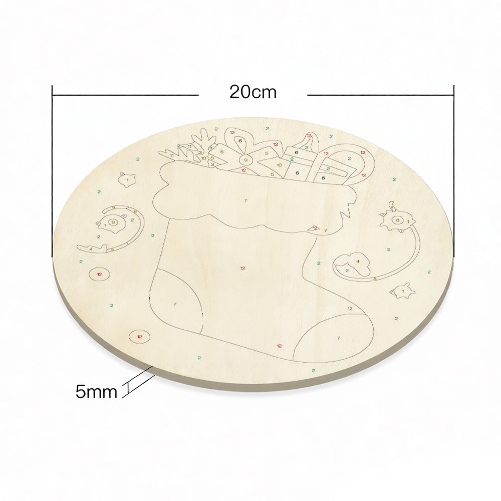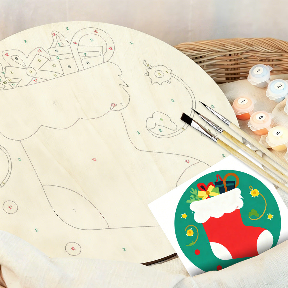 Paint by Numbers on Wood Slice - Christmas Stocking filled with Gifts