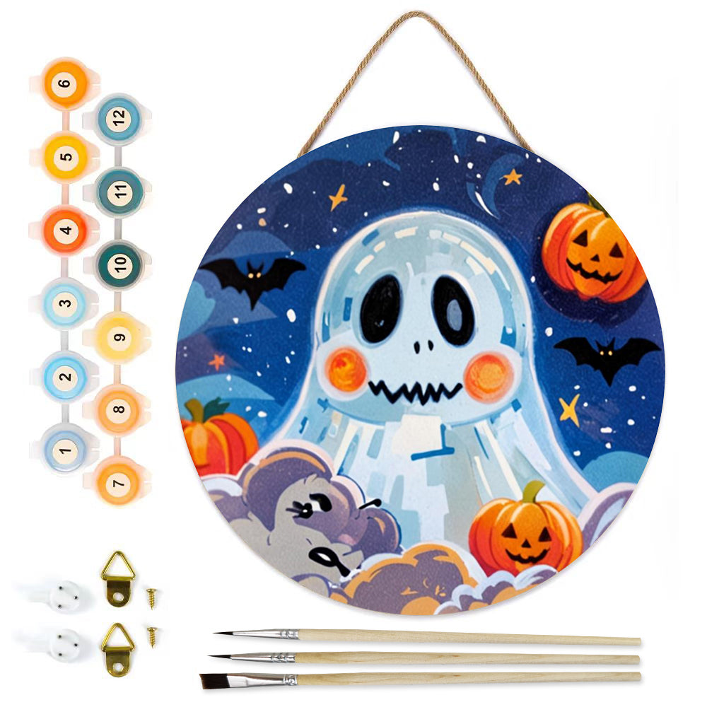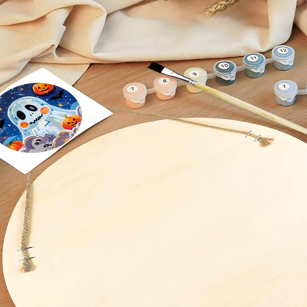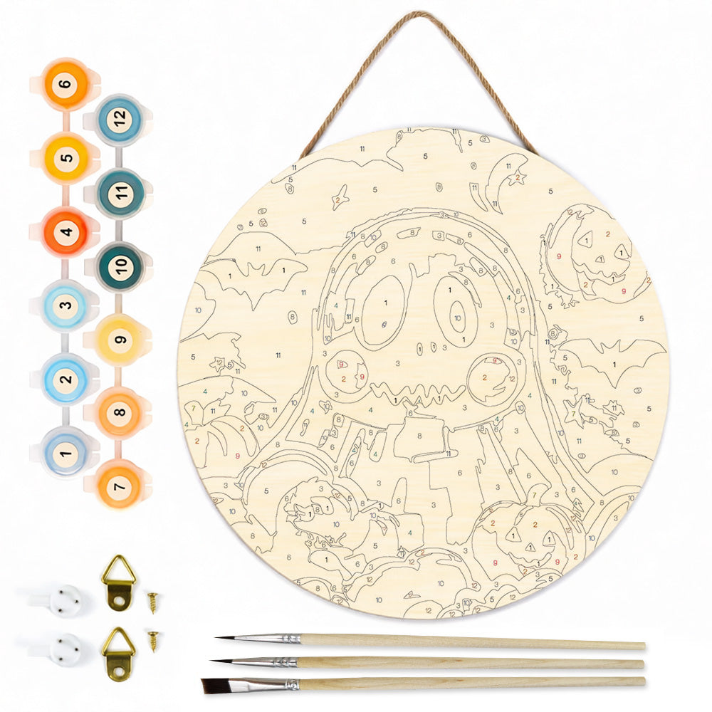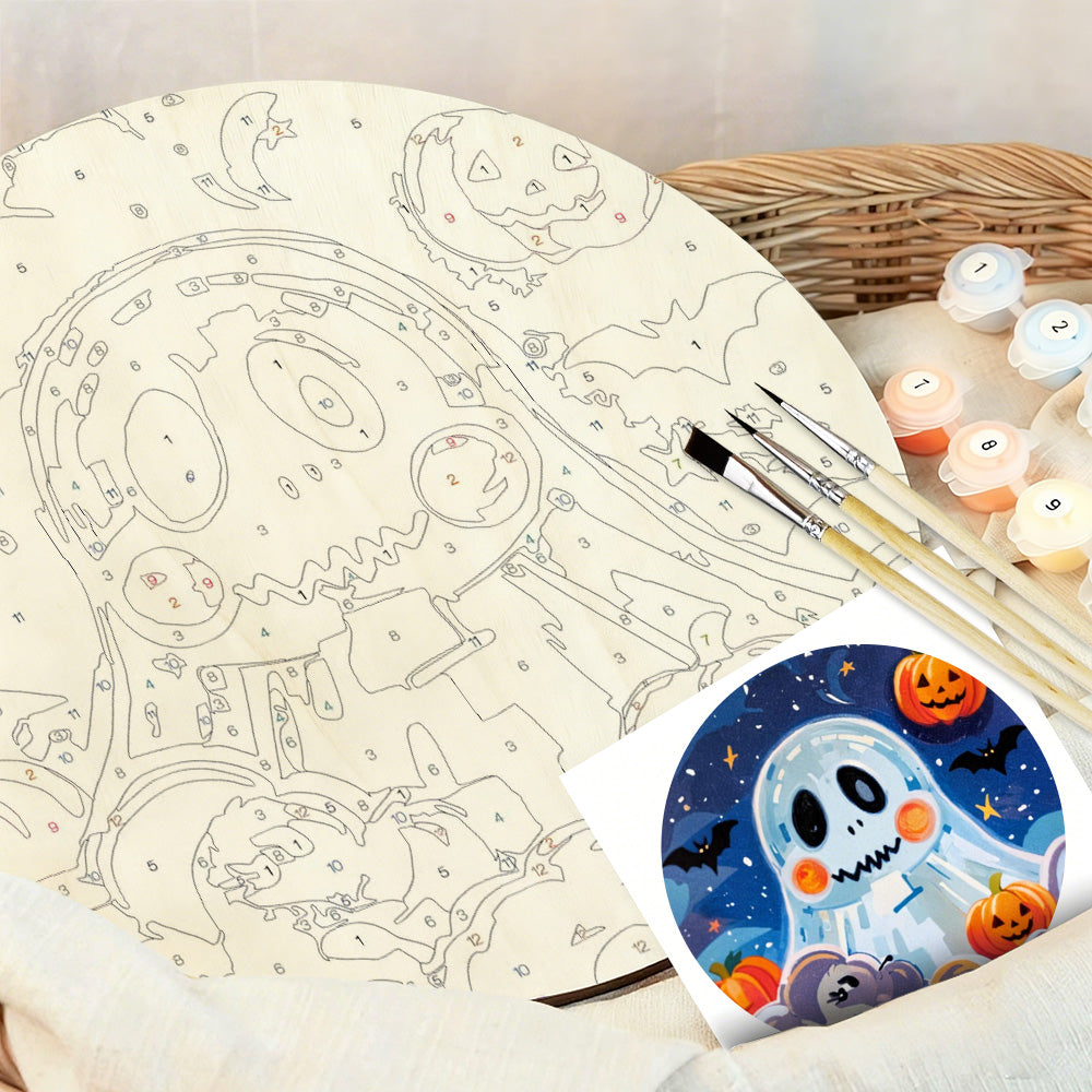 Paint by Numbers on Wood Slice - Cute Halloween Ghost and Pumpkin Lanterns