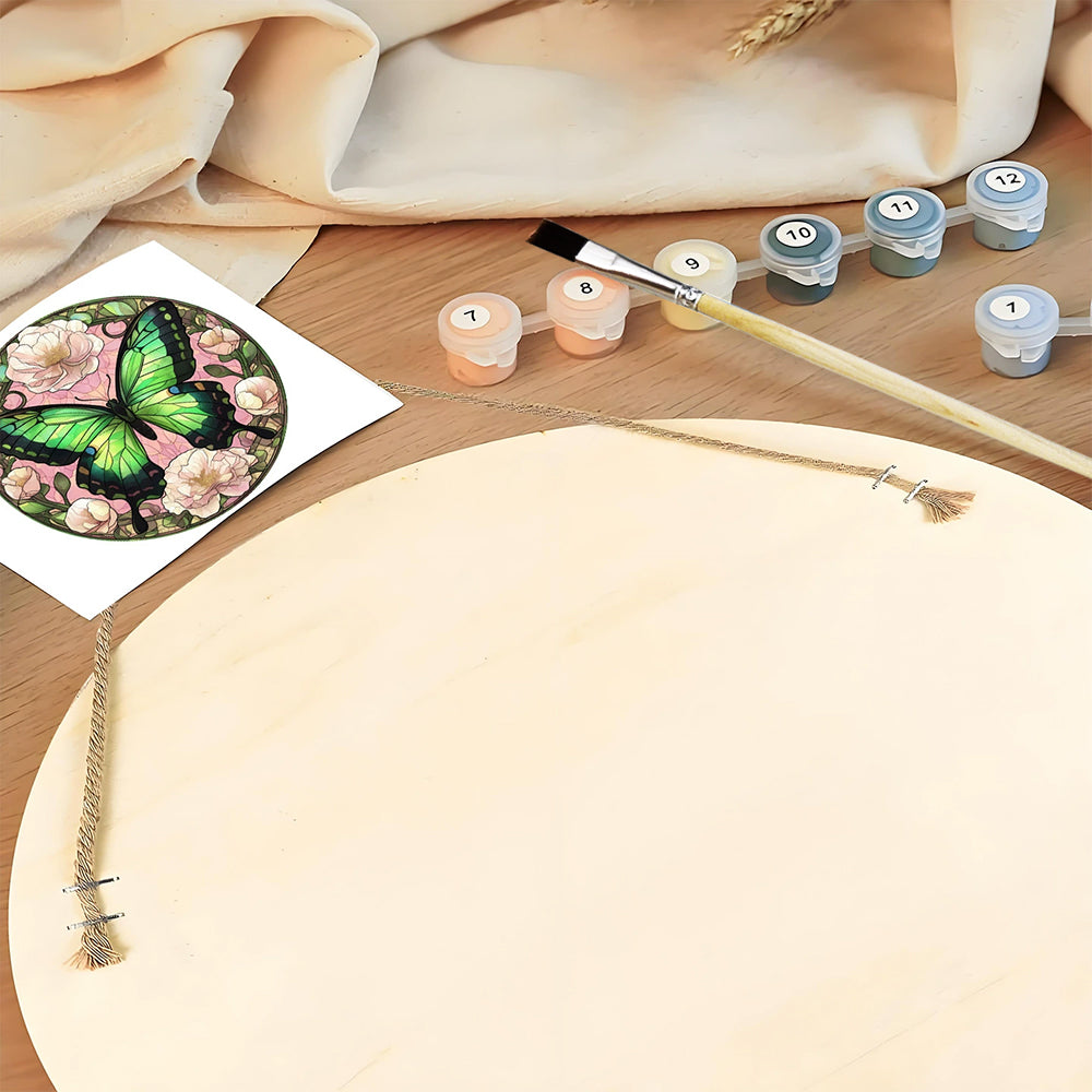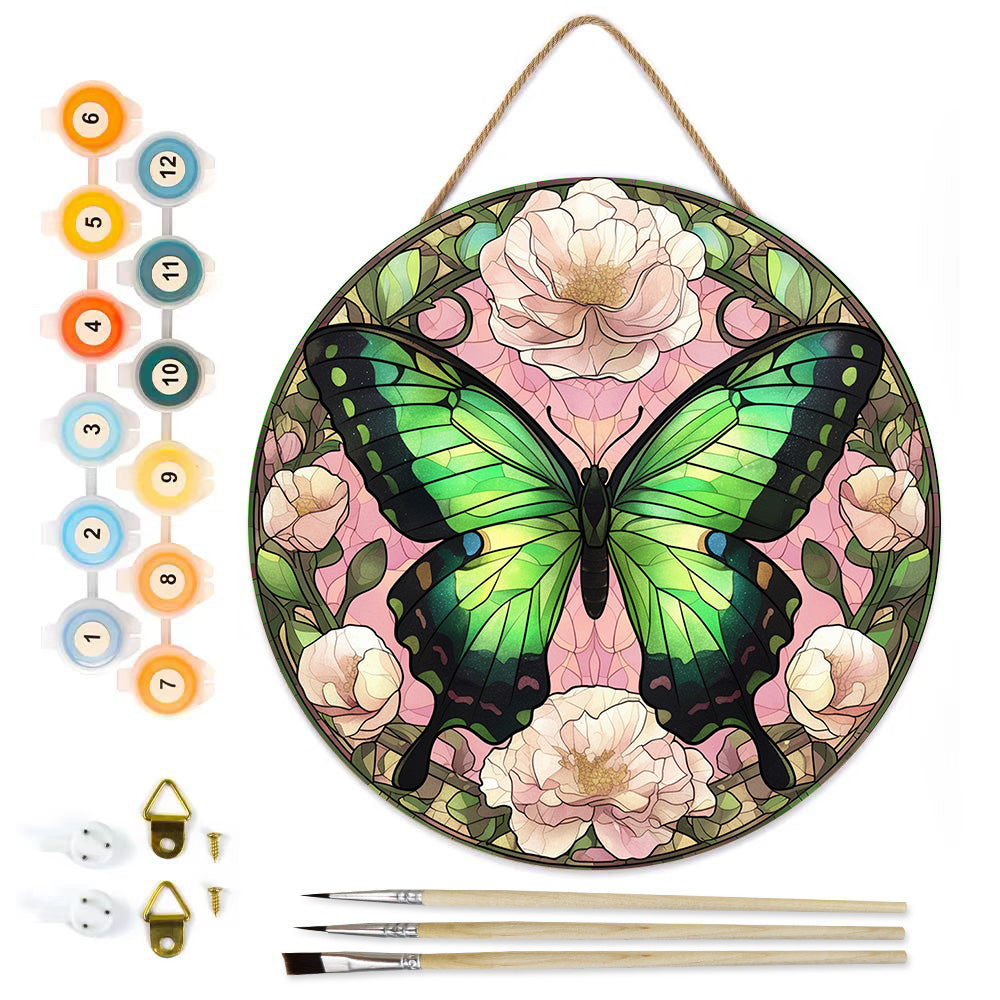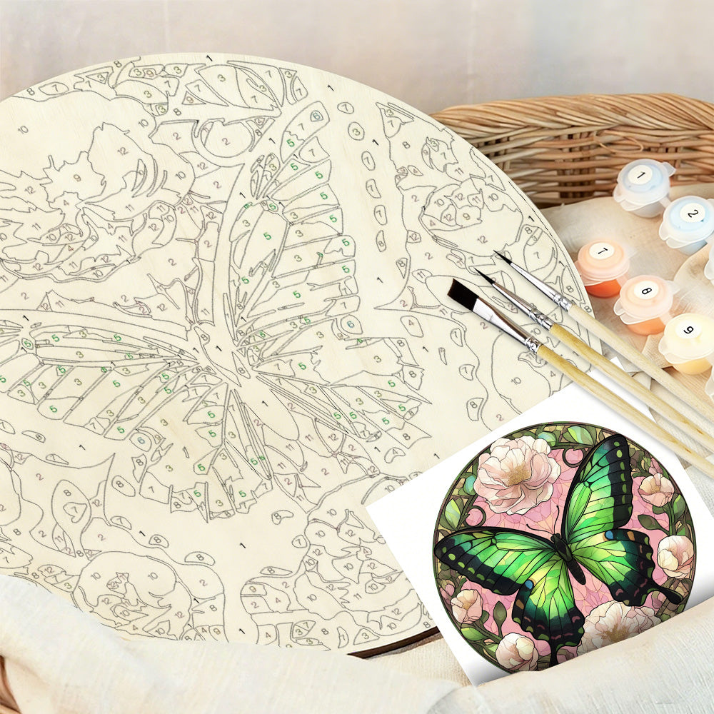 Paint by Numbers on Wood Slice - Green Butterfly among the Flowers