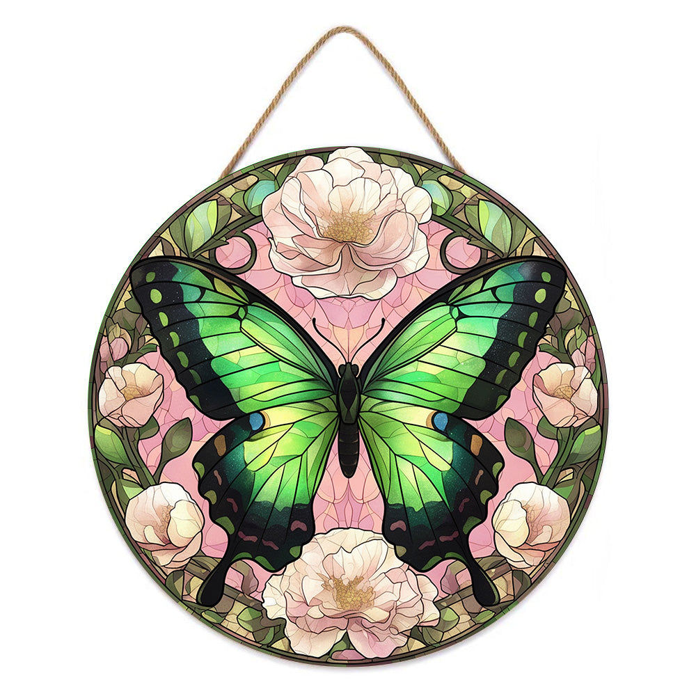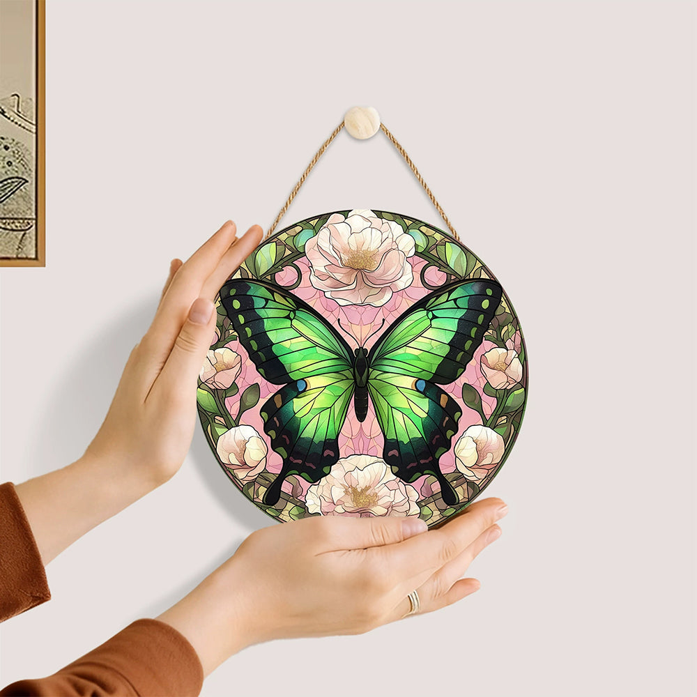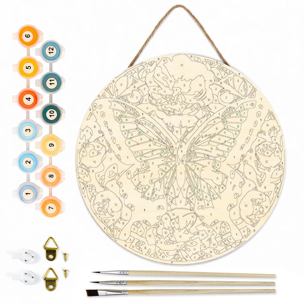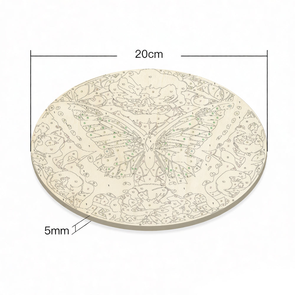 Paint by Numbers on Wood Slice - Green Butterfly among the Flowers