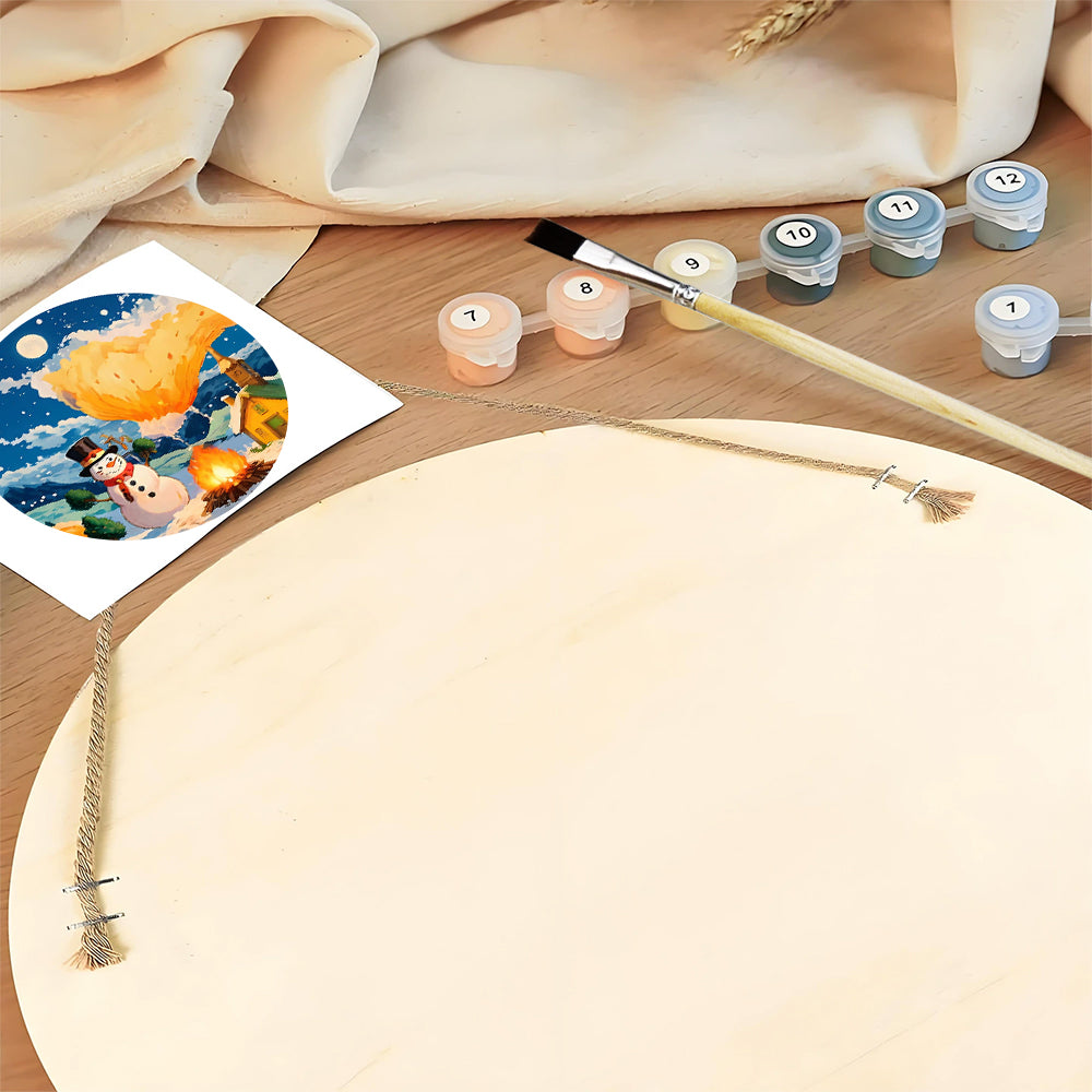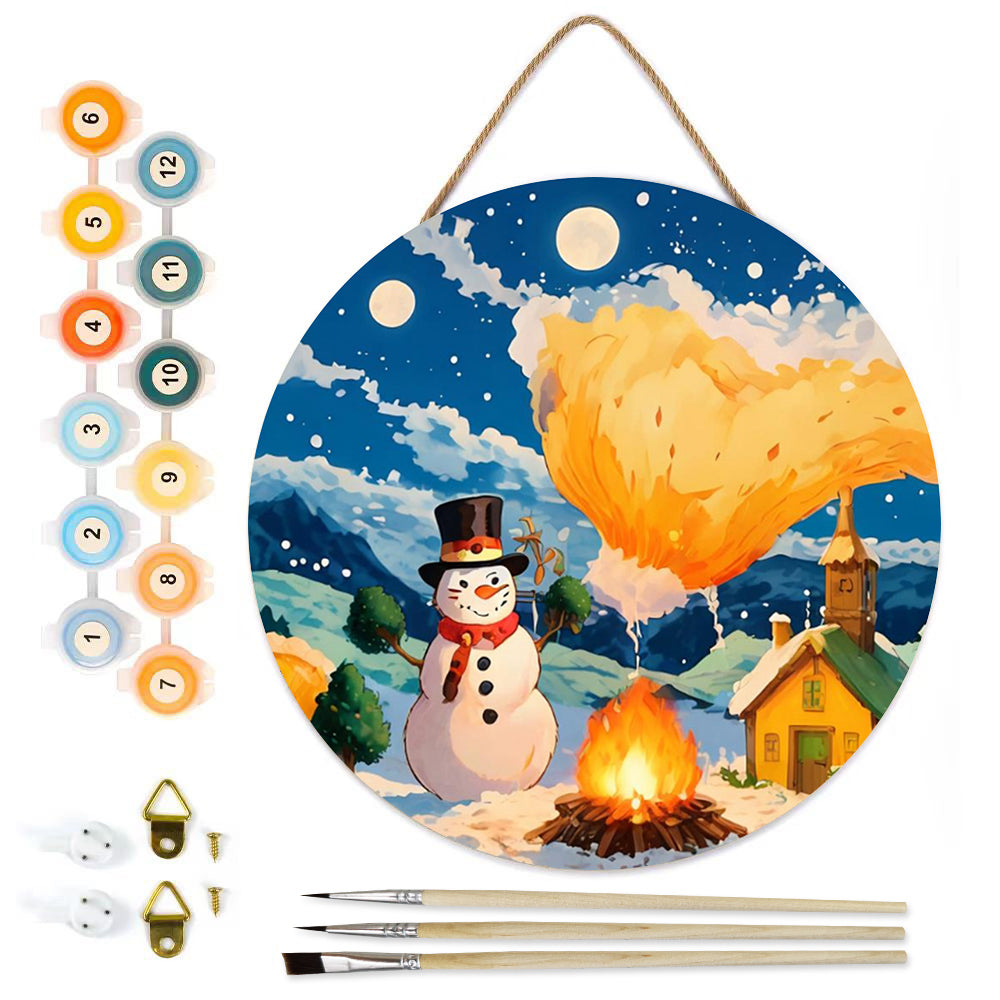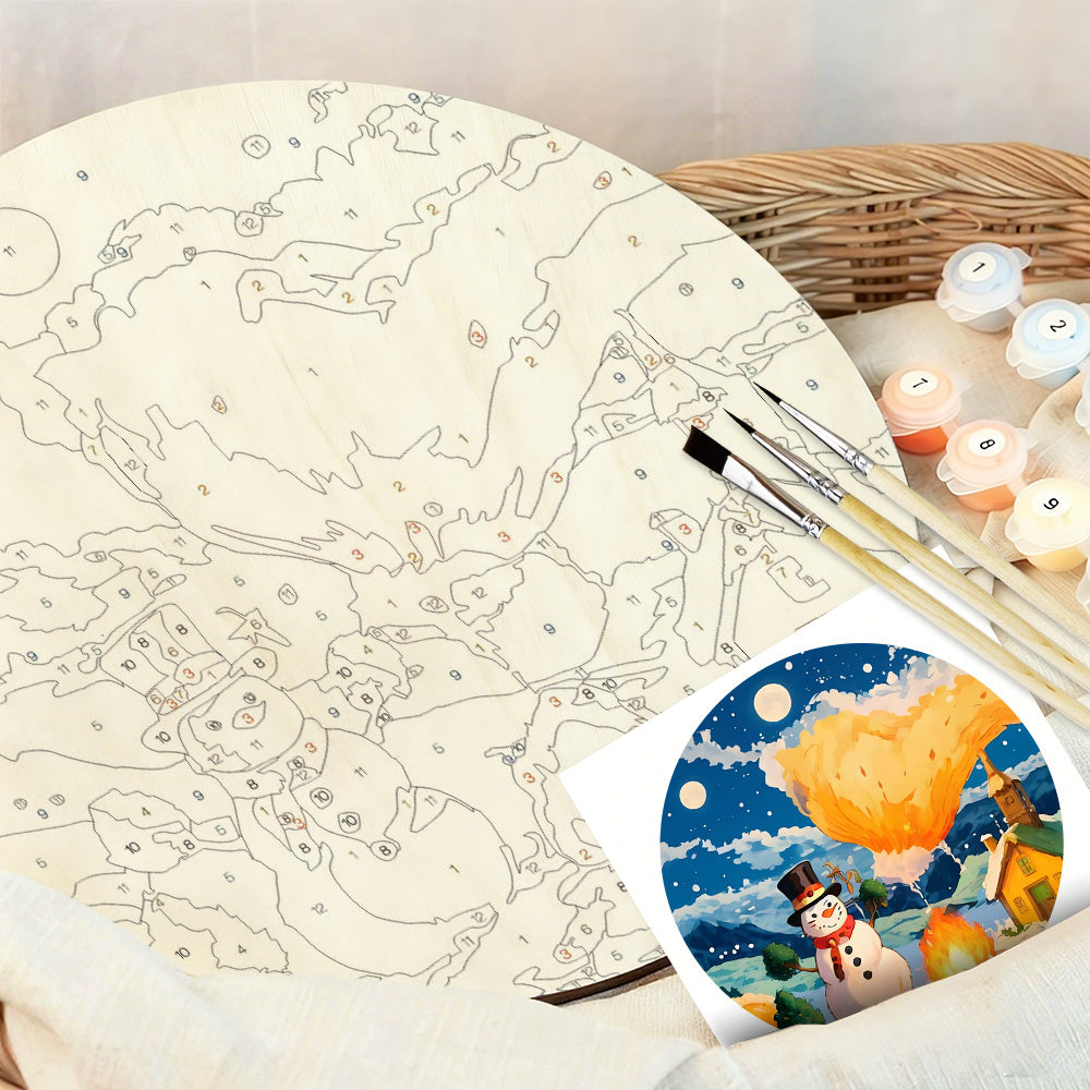 Paint by Numbers on Wood Slice - Snowman by the Campfire