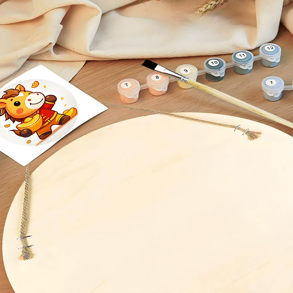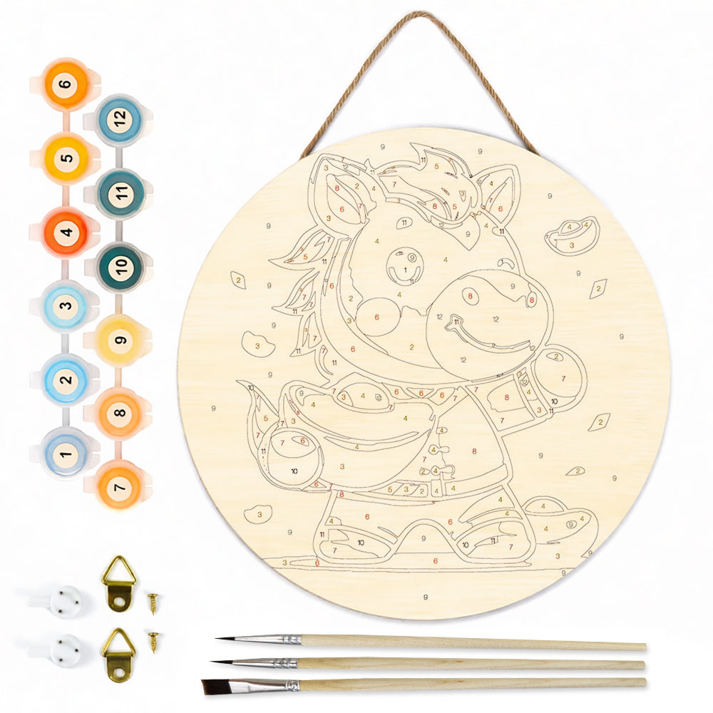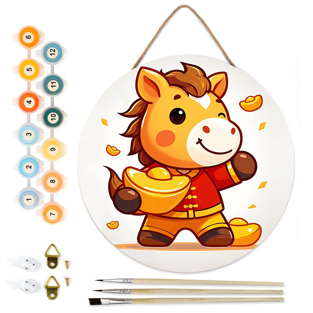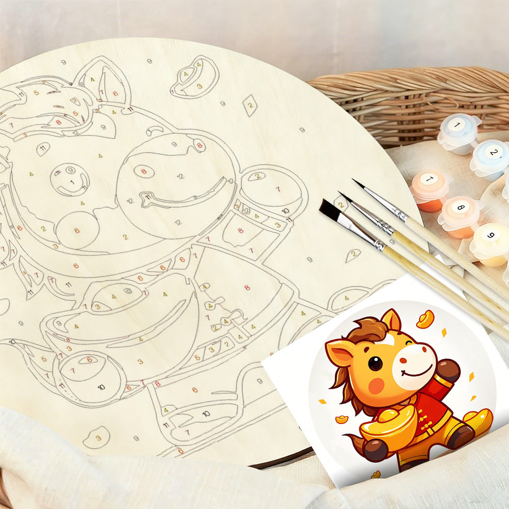 Paint by Numbers on Wood Slice - The Proud Horse Holding a Gold Ingot